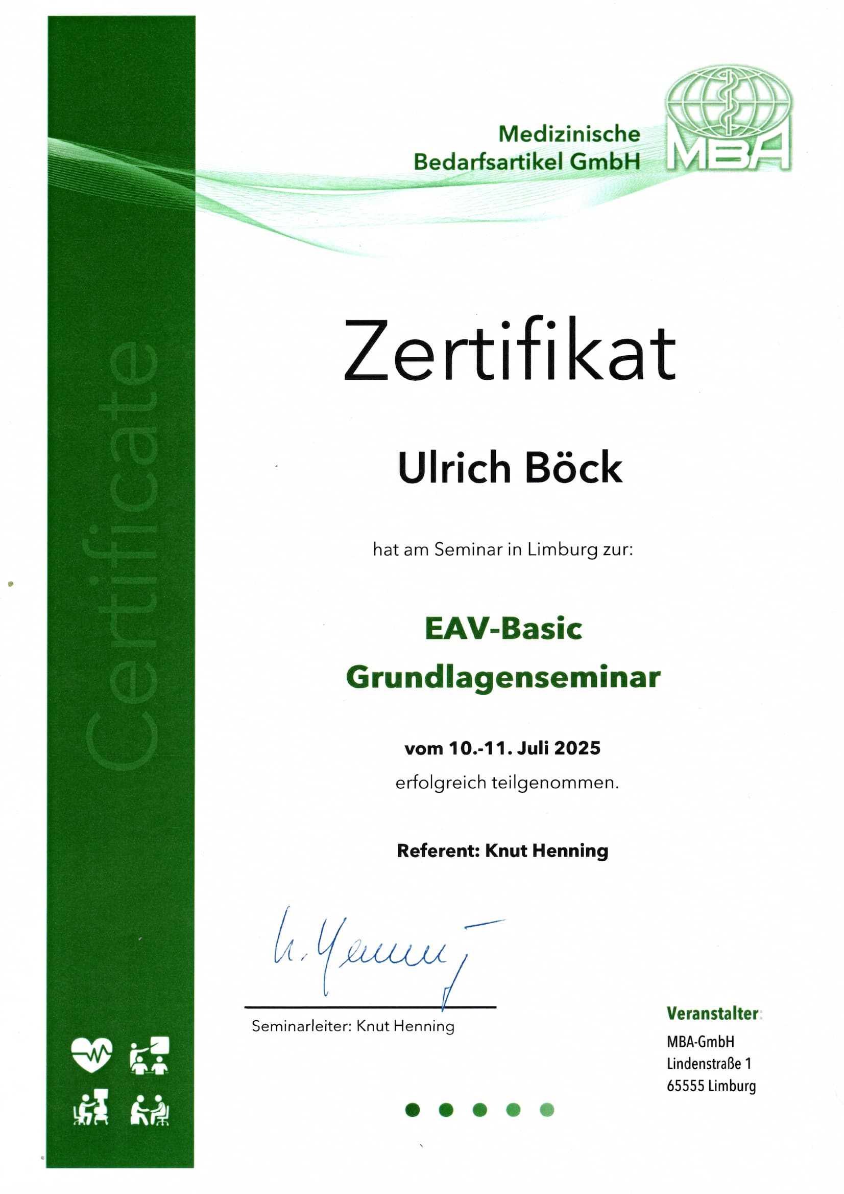 Die folgenden Qualifikationen bilden das Fundament meiner Arbeit. Weitere Fortbildungen – insbesondere im Bereich  der EAV Systemanalyse – sind in Vorbereitung.